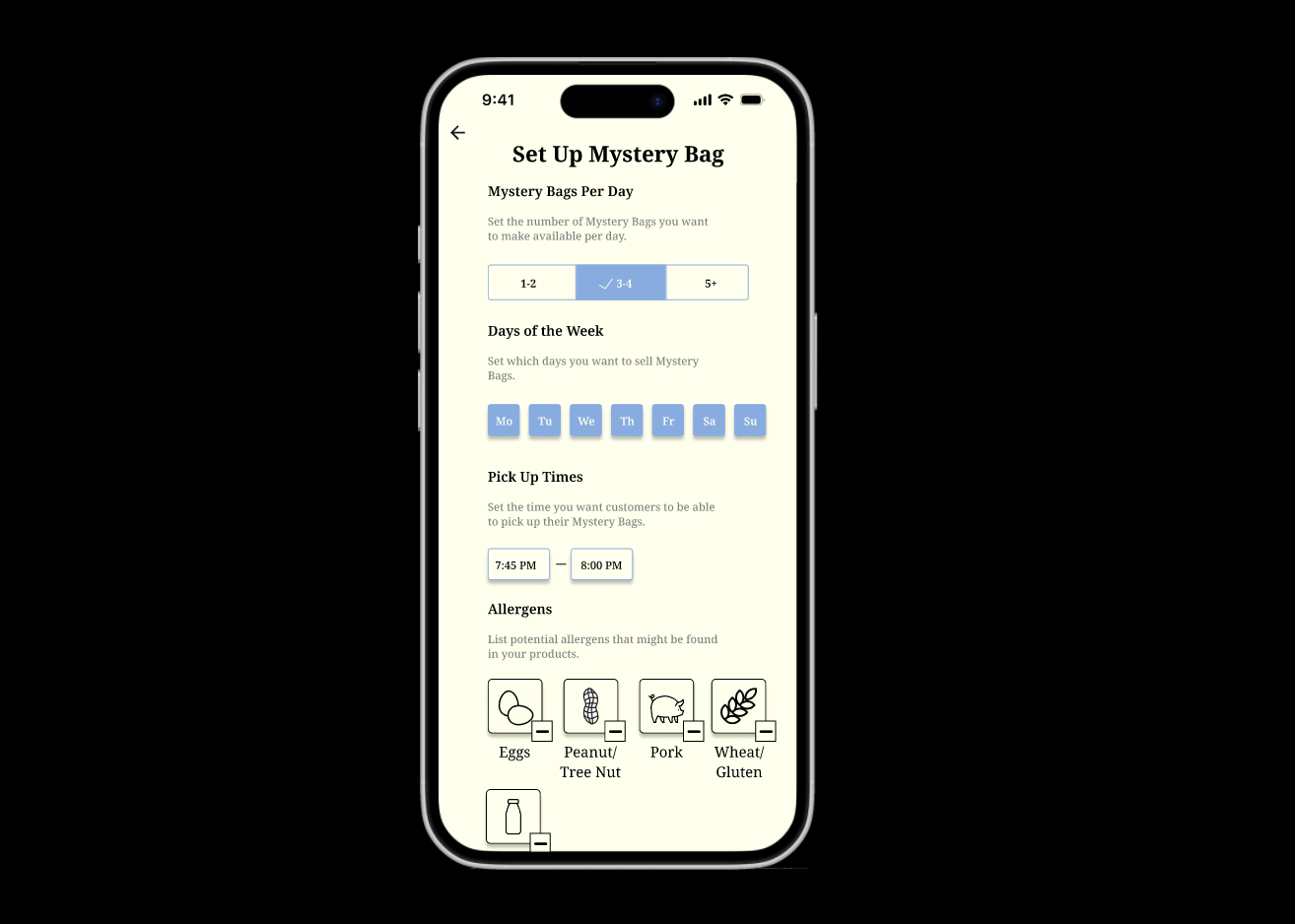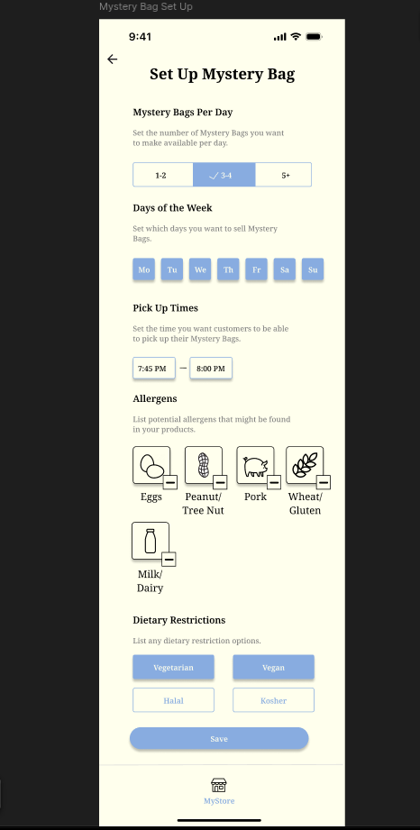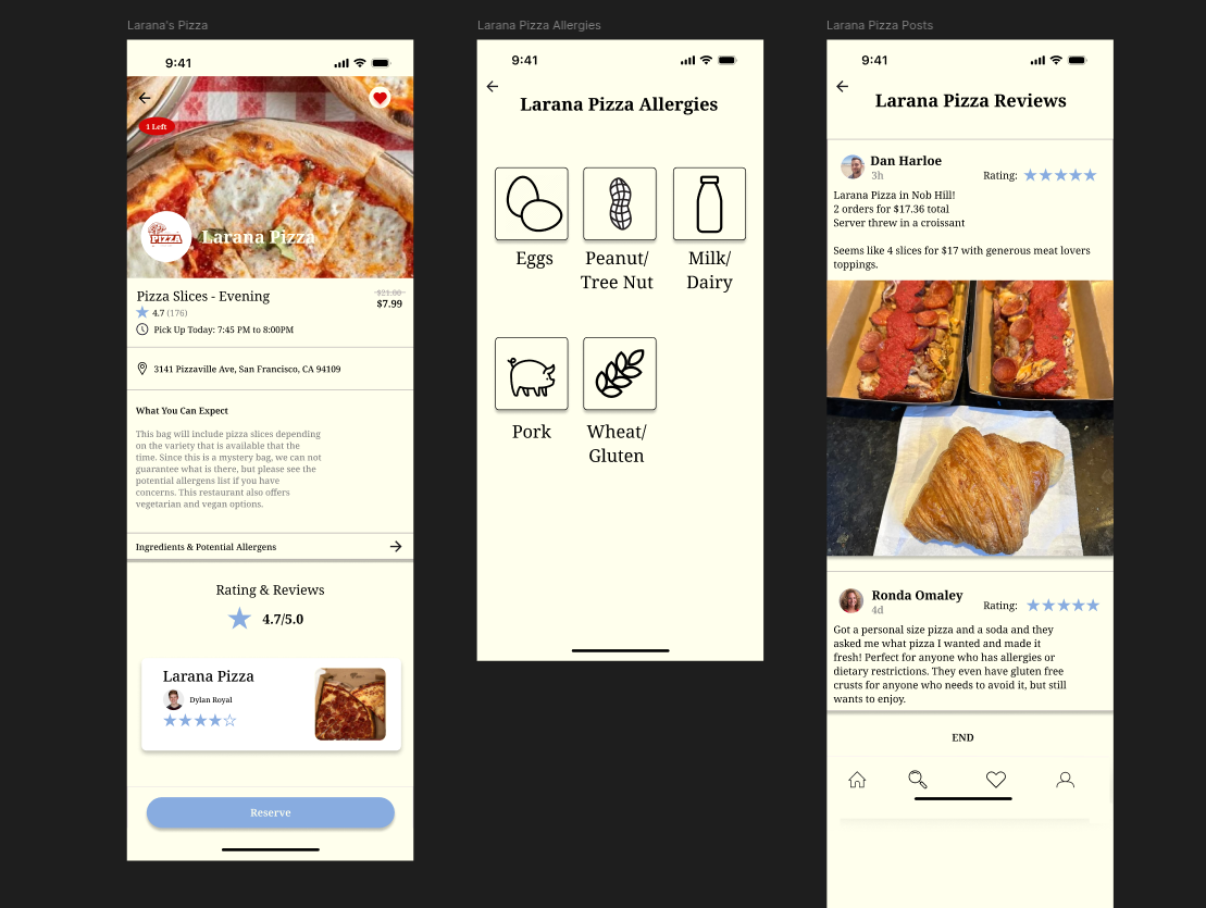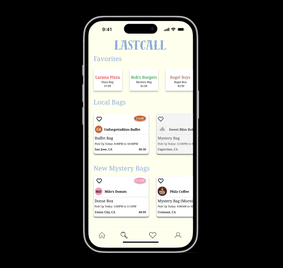 "LastCall" is a food waste reduction app where restaurants can post surplus food and consumers can purchase it at discounted costs. Customers can post detailed reviews about the food they received and can tailor their profiles for their specific needs (dietary restrictions, geographic location). Designed in Figma, 2024.